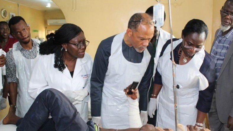 | Lagos State Commissioner for Health, Prof Akin Abayomi (center) alongside medical personnel in a hospital. [Twitter/@Foll owLASG] |